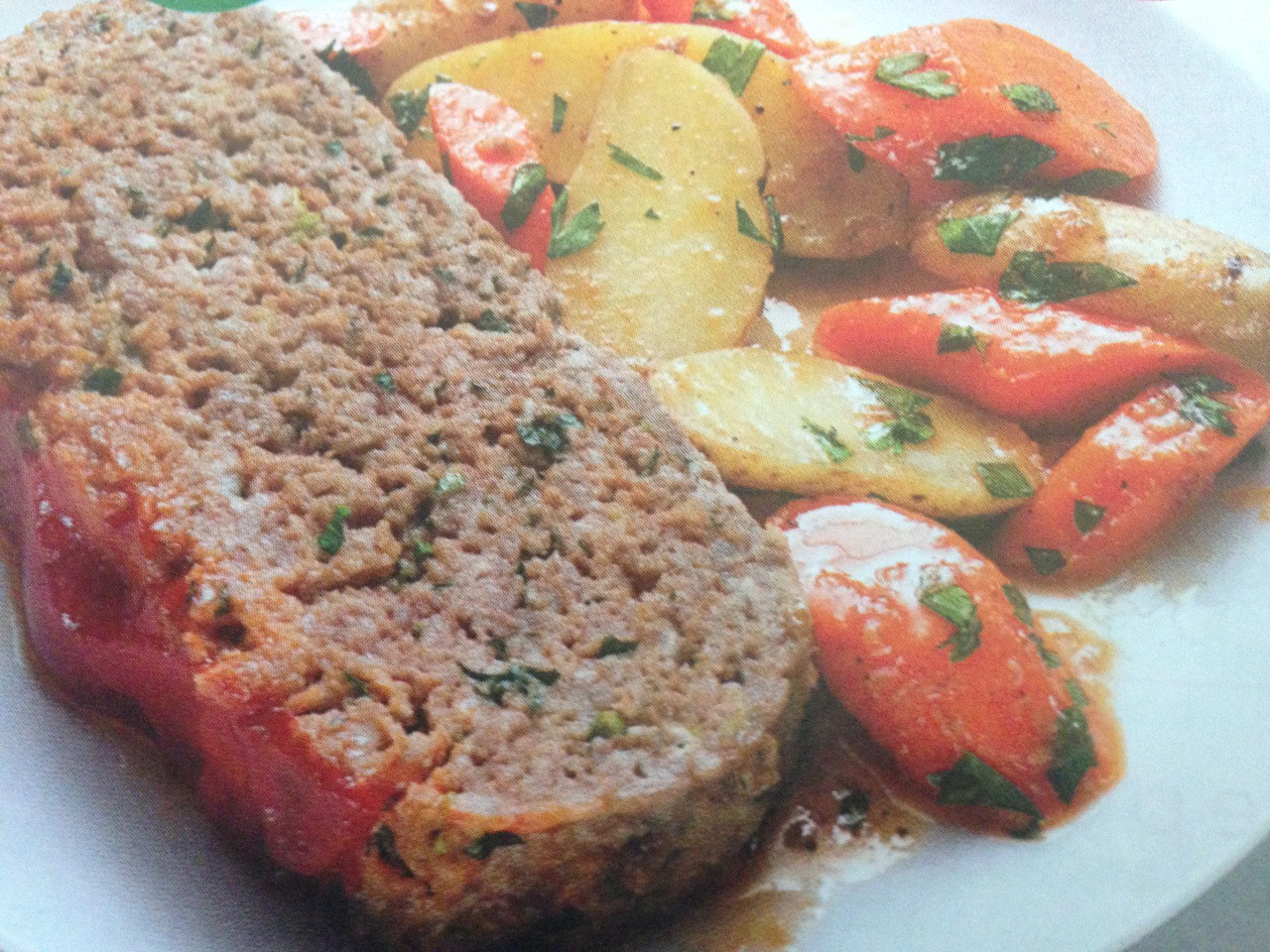 2. Transfer to a 6 quart slow-cooker scatter the potatoes and carrots over the around the meatloaf. pour the chicken broth cover and cook for 8 hours on low or 4 hours on high.